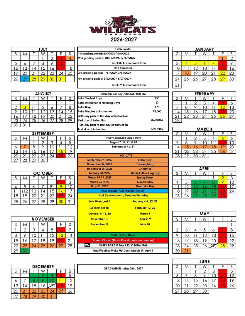 Please carefully review the board approved calendar for the 2026-2027 school year. This calendar is very different from the ones we have had the last few years.